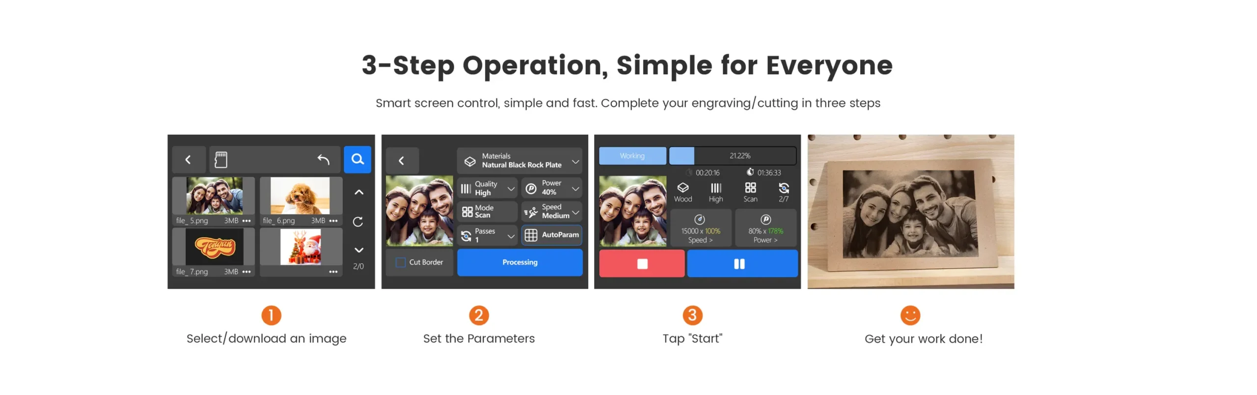 | 22W One Pass cutting capacity | Birch plywood: 10mm Basswood plywood: 15mm Eucalyptus plywood: 5mm Black acrylic: 10mm Black ABS board: 4mm MDF: 3mm Paulownia wood: 15mm Bamboo: 8.5mm Gray cardboard: 3mm Steel plate: 0.1mm |