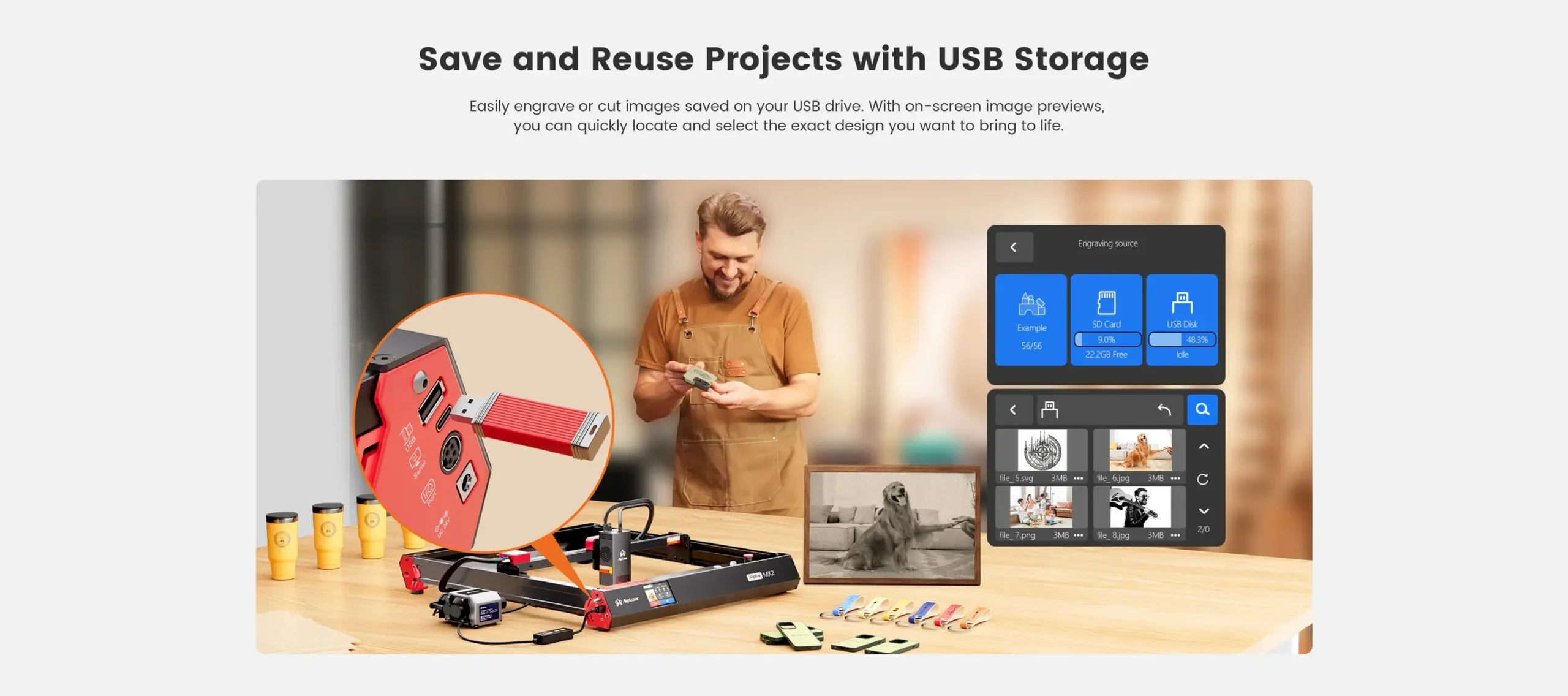 | 22W thickest cutting capacity | Soft pine board: 30mm Birch plywood: 12mm Eucalyptus plywood: 15mm Basswood plywood: 20mm Black acrylic: 50mm |